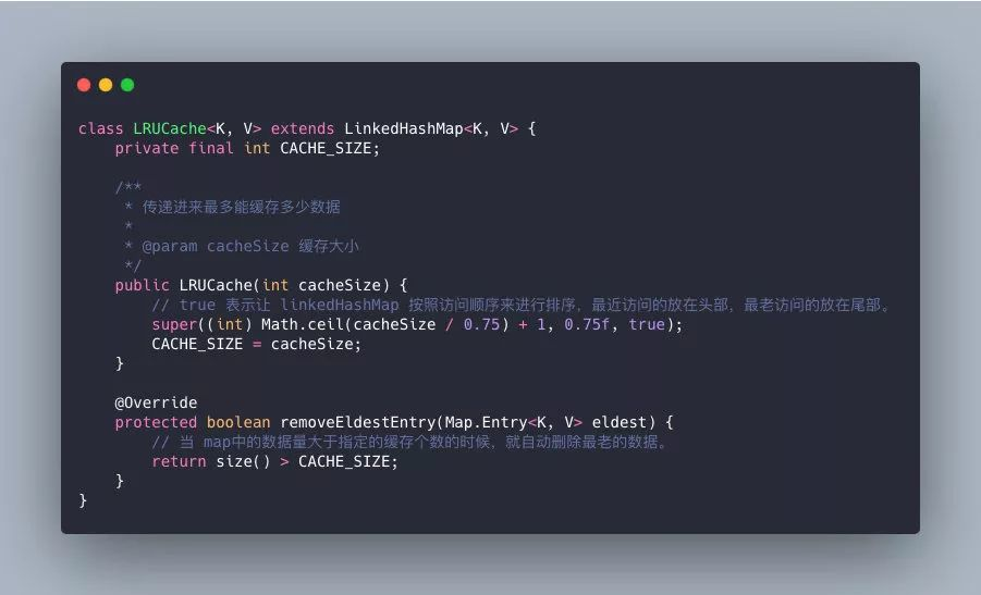 其实在大家熟悉的LinkedHashMap中也实现了Lru算法的,实现如下: