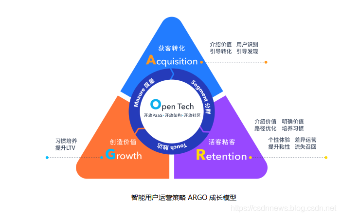 专为解决用户运营的具体业务挑战而设计,易观方舟基于多年用户运营研究和实践提出了“智能用户运营 ARGO 成长模型”,帮助企业设计用户运营目标及策略,从Acquisition 获客转化、Retention 活客粘客再到 Growth 创造价值,构建Open开放的用户运营平台,站在用户视角将运营重点放在用户旅程对应阶段的个性化需求上,在正确的时间实施正确的运营策略及触达动作,追求用户运营效率和收益的最大化。