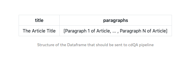 你必须在特定的结构中设置数据帧(CSV),以便将其发送到 cdQA 管道。