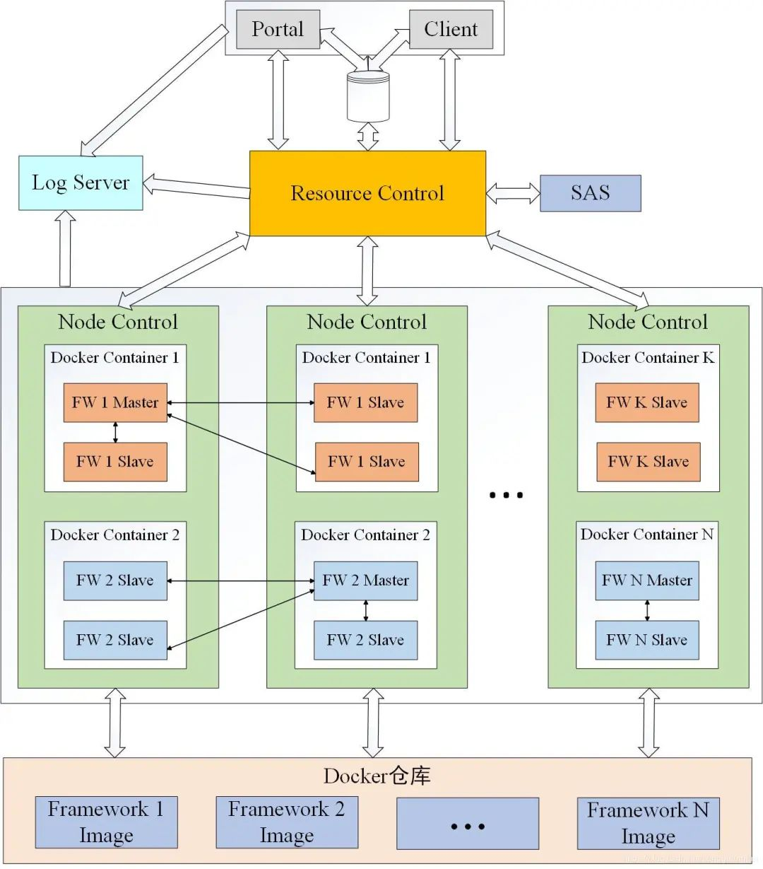 Portal/Client:Portal 和 Client 提供给用户不同的操作接口,拥有相同的协议。用户可以提交制作好的框架的 Image(镜像),启动关闭框架,以及查询平台的资源情况和框架的资源使用情况,同时提供框架业务数据查询的重定向功能。