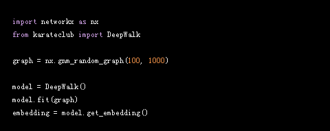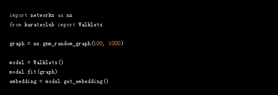 第三,DeepWalk和Walklets类提供的公共方法的行为相同。嵌入是通过fit()学习的,并由get_embedding()返回。当用于特征提取的上游非监督模型性能较差时,这可以快速、最少地更改代码。