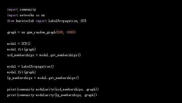 我们将通过下面的代码片段演示标准化的输出生成和接口。我们创建随机图的集群,并返回包含集群成员资格的字典。使用外部社区库,我们可以计算这些集群的模块化。