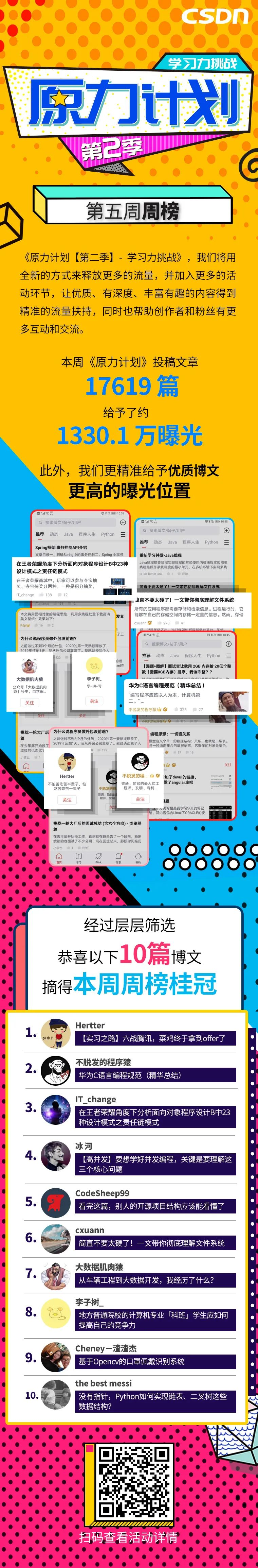 自2月21日起,《原力计划【第二季】—学习力挑战》已进行到第五周,吸引16000多名博主参与,本周共收17619篇原创投稿,精选10篇入围周榜。