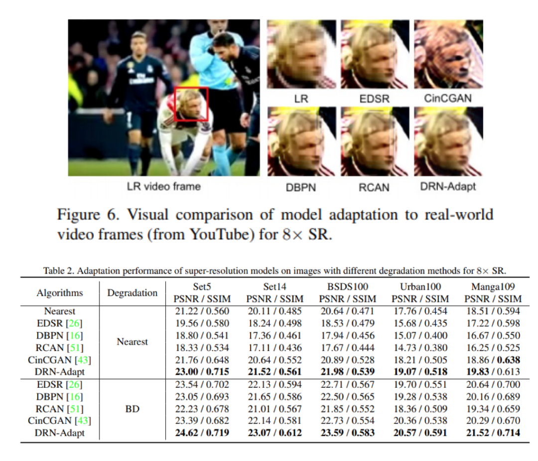 为了解决第二个问题,由于LR图像的回归不依赖于HR图像,因此我们的方法可以直接从LR图像中学习。通过这种方式,本文方法可以轻松地将SR模型调整为适用于现实世界中的LR数据,例如来自Youtube的原始视频。实验证明了本文的方法优于SOTA方法。