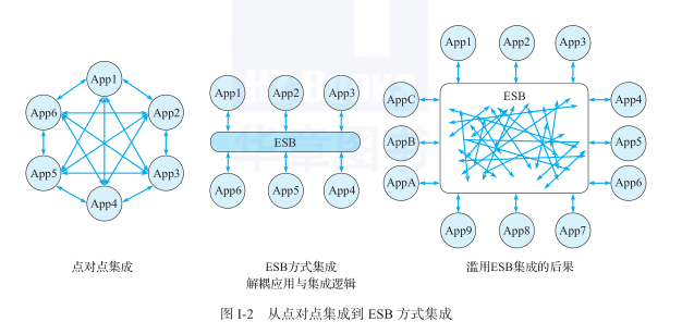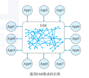 1) 由于过度强调业务系统的可复用性,而不是对企业IT架构的治理和重构。大量服务集成的实现逻辑被下沉到ESB内部,从而导致ESB滥用,如图I-2 最右侧图所示,这些逻辑非常难以维护,难以移植和扩展,成为ESB不可承受之重。我们必须在合适的地点合理地处理复杂性,而非将其简单转移。
