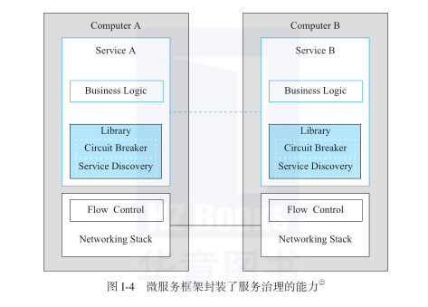 微服务架构还要面对分布式架构的内生复杂性,请参考文章“分布式计算的误区”。微服务框架需要能够解决服务通信和服务治理的复杂性,比如服务发现、熔断、限流、全链路追踪等挑战。微服务框架,如HSF、Dubbo或Spring Cloud以代码库的方式来封装这些能力。这些代码库被构建在应用程序本身中,随着应用一起发布和维护,如图I-4所示。