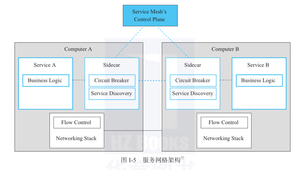 为了解决上述挑战,社区提出了服务网格(service mesh)架构。它重新将服务治理能力下沉到基础设施,在服务的消费者和提供者两侧以独立进程的方式部署。这样既达到了去中心化的目的,保障了系统的可伸缩性;也实现了服务治理和业务逻辑的解耦,二者可以独立演进不相互干扰,提升了整体架构演进的灵活性;同时服务网格架构减少了对业务逻辑的侵入性,降低了多语言支持的复杂性,如图I-5所示。