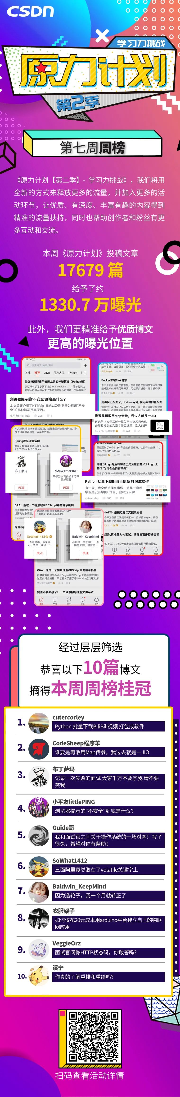 自2月21日起,《原力计划【第二季】—学习力挑战》已进行到第7周,累计22000+博主参与。本周收到17679篇原创投稿,经筛选,10篇佳作入围周榜。