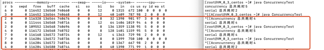 这里我们需要使用一个命令叫做:"vmstat 1",这个命令是linux系统上的,可对操作系统的进程、虚拟内存、CPU活动进行监控。看下图CS(Content Switch) 表示上下文切换的次数,从图可见系统一般CS的值维持在600~800之间,当我们一直在运行ConcurrencyTest程序时,很明细发现CS飙升到1000以上。