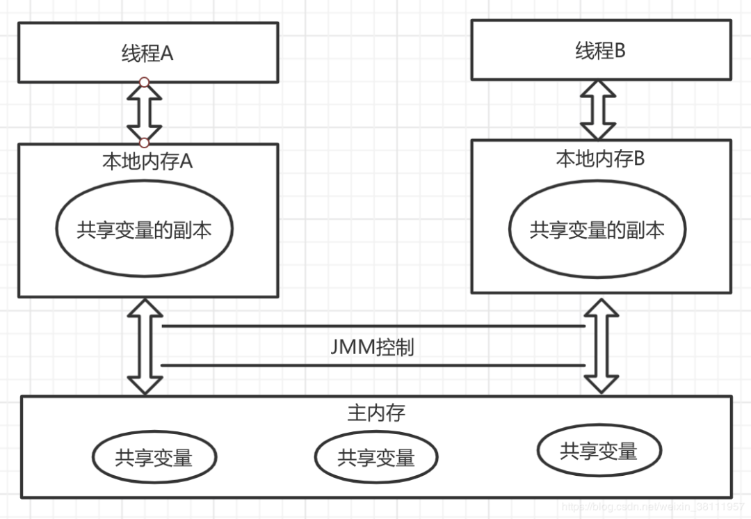 Java内存模型全称:Java Memory Model ,简称Java内存模型或者JMM,Java线程之间的通信由JMM来控制,JMM决定一个线程对共享变量的写入,何时对另外一个线程可见。我们由图可见,线程之间的共享变量是存储在主内存当中,每一个线程都有一个属于自己的本地内存(也可以叫做工作内存),这个本地内存中存储了主内存当中的共享变量。就相当于把主内存的共享变量copy了一份给自己。为了提供效率,线程是不会直接与主内存进行打交道,而是通过本地内存来进行数据的读取。