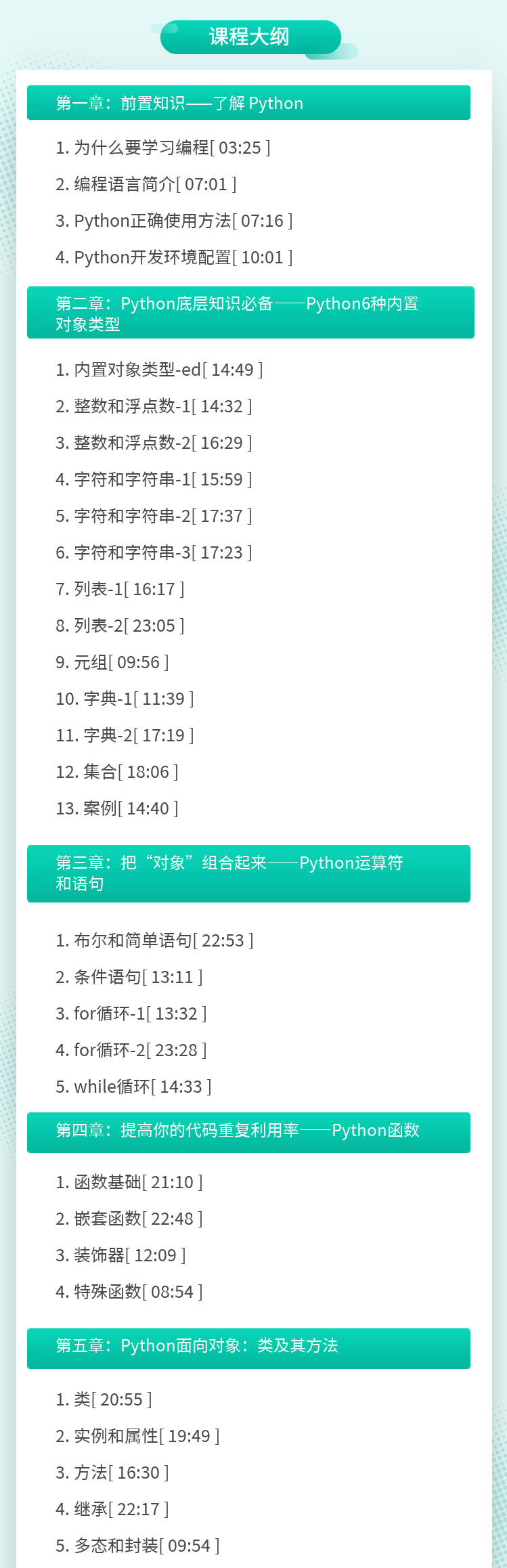 没基础?没时间?难坚持?怕麻烦?《8小时Python零基础轻松入门》共计34课时,526分钟,每天学习1小时的话8天就能完成课程学习。不到两周就能掌握Python在工作中常见的运用情景。