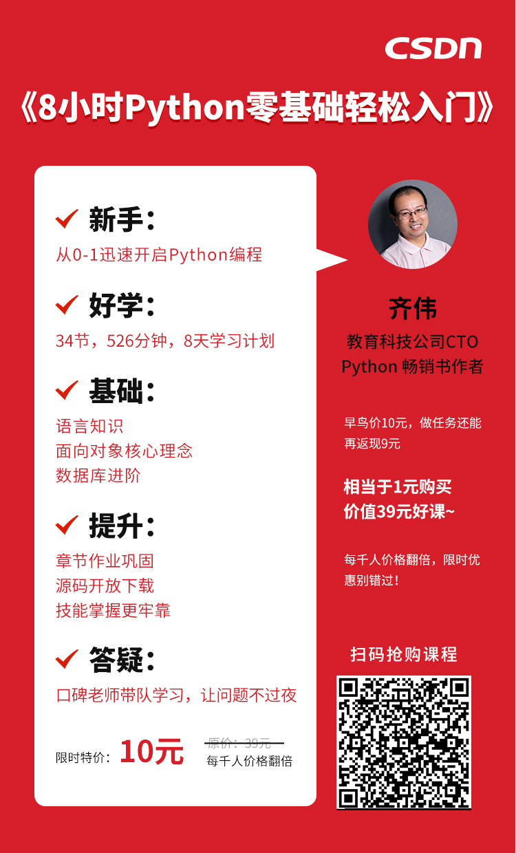 这门课是由Python畅销书作家,科技公司CTO齐伟老师主讲,34节课程+8天学习计划+实战作业练习+答疑服务,只需10元!参与活动还能再返现9元,这意味着最低1元就能学到原价39的Python好课!
