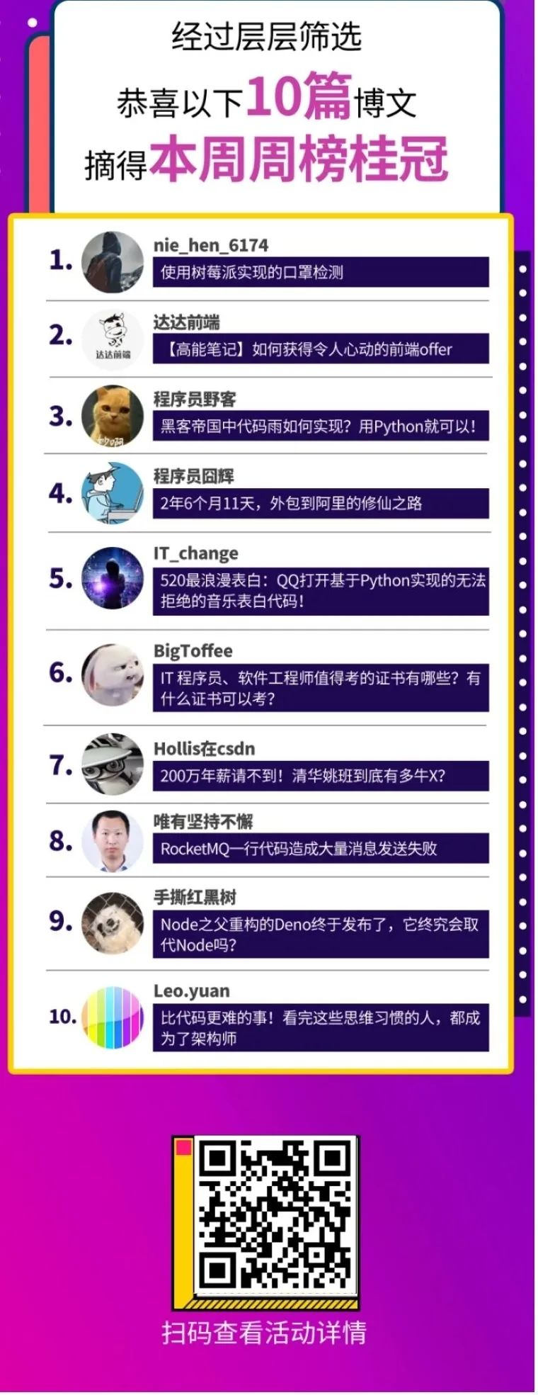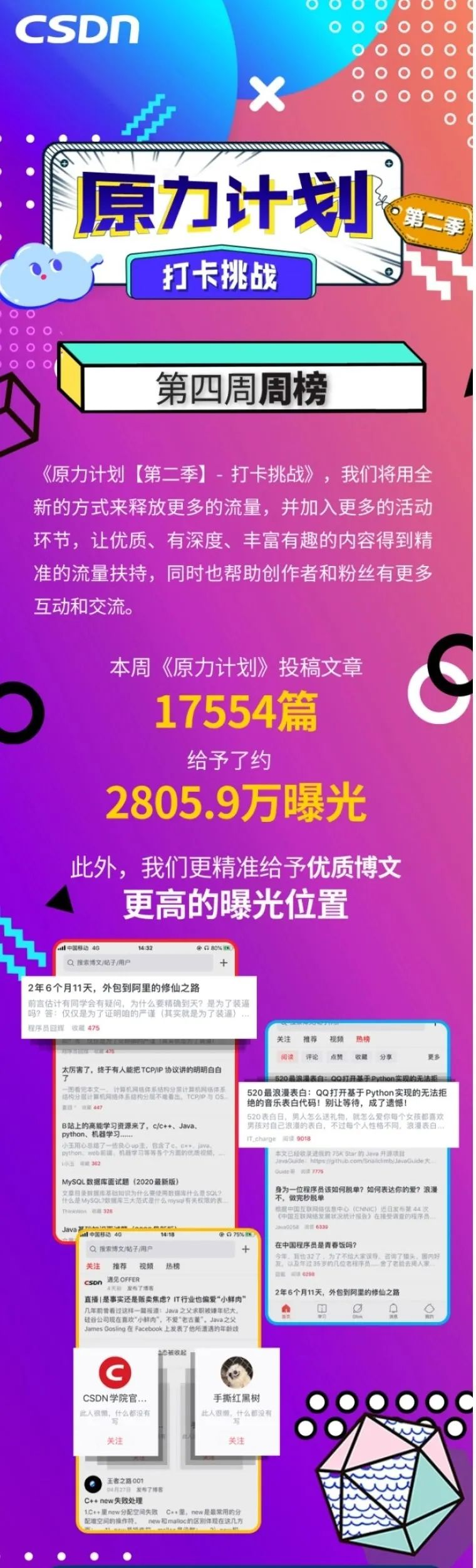 本周《原力计划【第二季】-打卡挑战》共收到活动投稿 23649 篇原创文章,经过层层筛选,最后选出以下 10 篇文章进入《原力计划【第二季】—打卡挑战》第 4 周周榜。