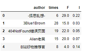F值:首先,先筛选出发布视频大于5的up主,视频播放量在5W以上的视频数少于5,说明可能是有些视频标题取得好播放量才高,而不是视频质量稳定的up主。