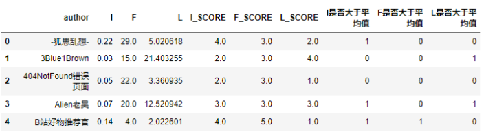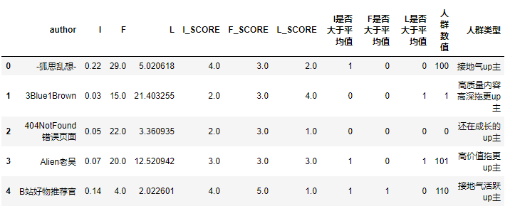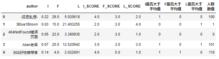 IFL['人群数值'] =(IFL['I是否大于平均值'] *100) +(IFL['F是否大于平均值'] *10) +(IFL['L是否大于平均值'] *1)