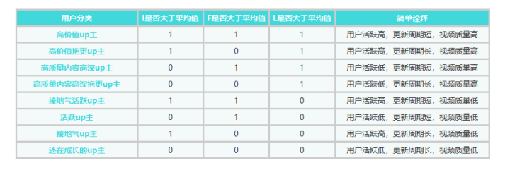 RFM经典的分层会按照R/F/M每一项指标是否高于平均值,把用户划分为8类,我们根据根据案例中的情况进行划分,具体像下面表格这样: