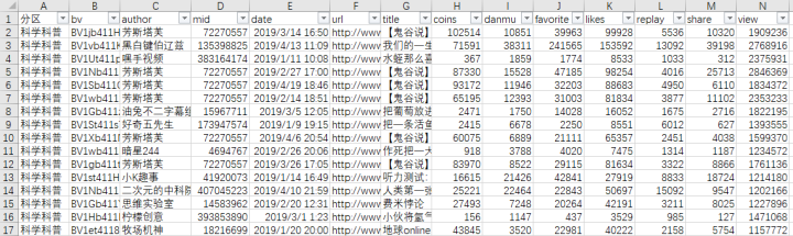 2019年1月~2020年3月,科技区播放量过5w视频的分区名称、作者名称、作者id、发布时间、播放数、硬币数、弹幕数、收藏数、点赞数、分享数、评论数,共计50130行。