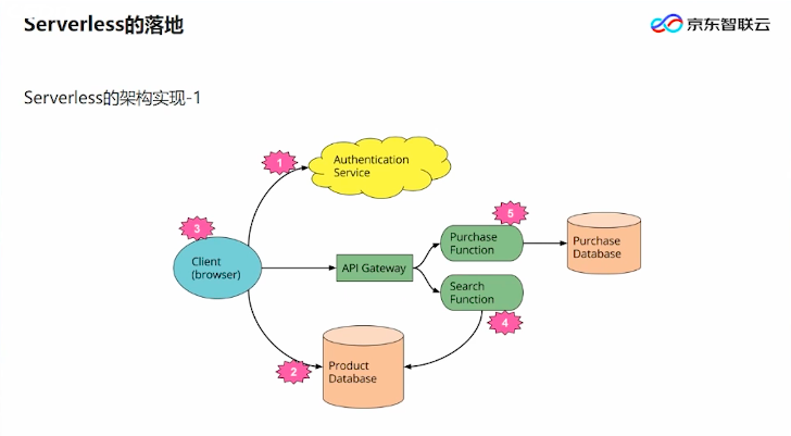 Serverless的常见三层架构:客户端、服务端、数据。所有的事情都可以在这里去处理,包括购买、搜索、用户管理等。