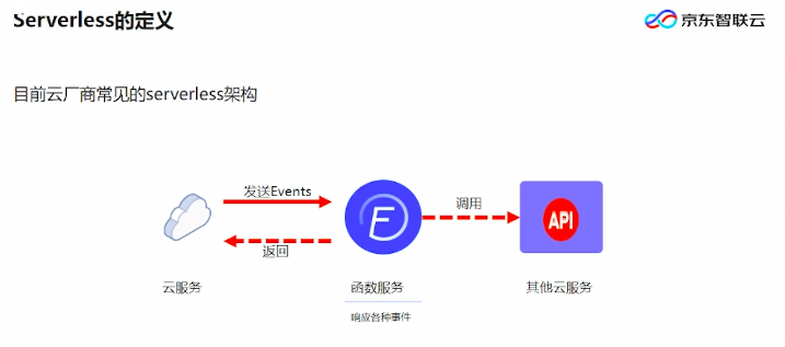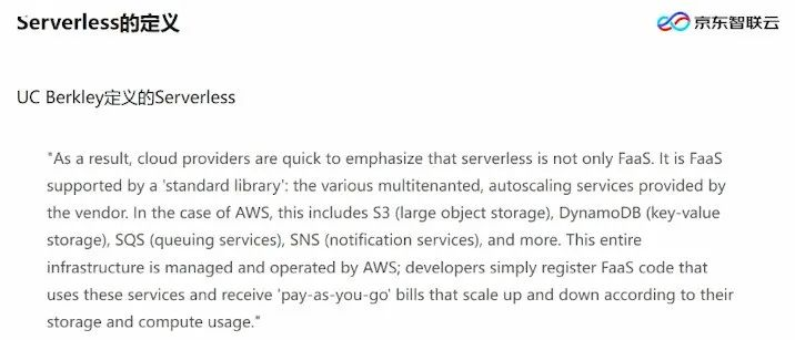 UCBerkley 曾对Serverless做过一个研究,主要强调了 Serverless 不是FaaS。各家公有云上都会有一些函数服务的产品,但这只是一个Serverless在计算层面上的抽象和实现,Serverless还有大量的服务,如 AWS 的 S3、京东的对象存储、KV存储等。Serverless 给大家带来的是便捷的申请,按需付费。