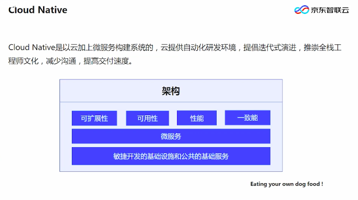 也就是说,CloudNative 不是某一种技术或最佳架构方式,而是一种集合,一般情况下,它与云有强相关,包括公有云、私有云,包括京东、BAT 内部也有一些云的架构,云的基础设施,在此基础上搭建一整套研发流程和团队的工作方式。