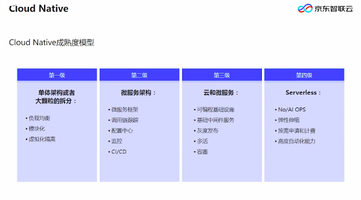 第四级:就是今天的重点,Serverless。Serverless的几个主要特色有: