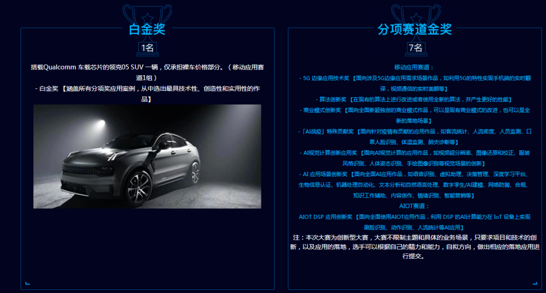现在,最激动人心的时刻来了!冲到最后的优胜者将获得什么奖励呢?本次主办的奖项设置没有让人失望,白金奖是一辆搭载高通车载芯片的领克 05 SUV,获奖者 1 名!