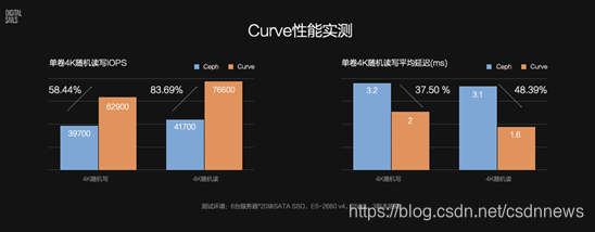 Curve和Ceph L版本的测试数据对比显示,在单卷的场景下,核心的4K随机读/写的IOPS性能,Curve分别是Ceph的1.84倍和1.58倍,同时延迟相比Ceph分别降低48.39%和37.50%。