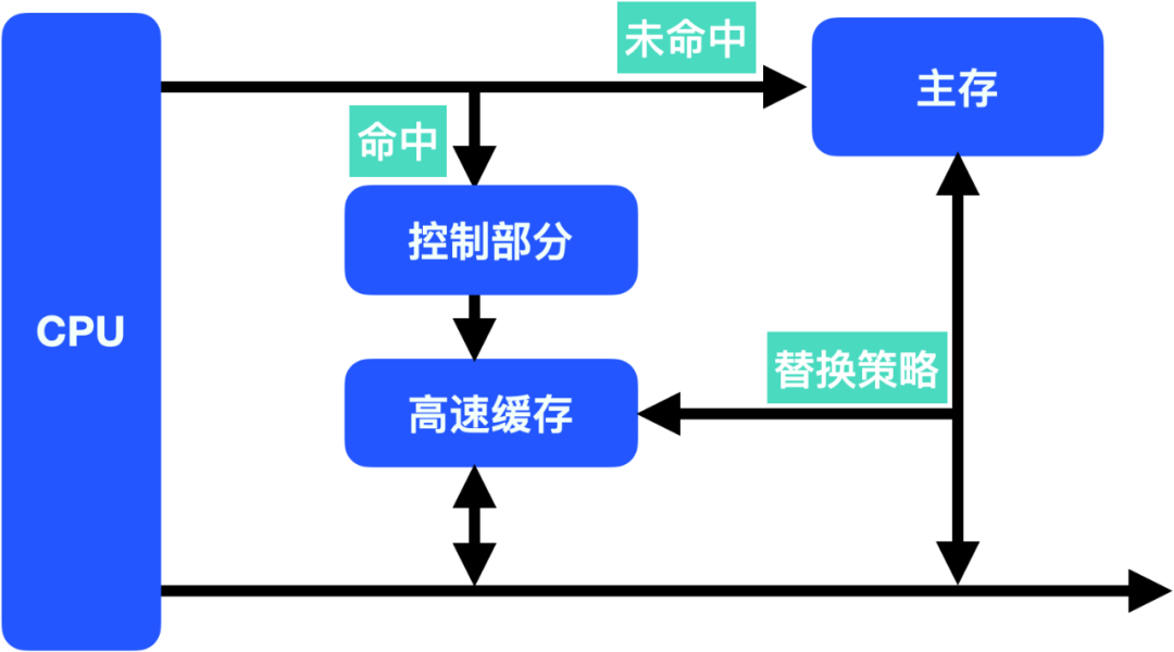 当 CPU 命中缓存时,即可直接对高速缓存的存储器进行寻址;未命中时,则需要根据缓存替换算法将主存中的数据块替换到高速缓存的存储器中。
