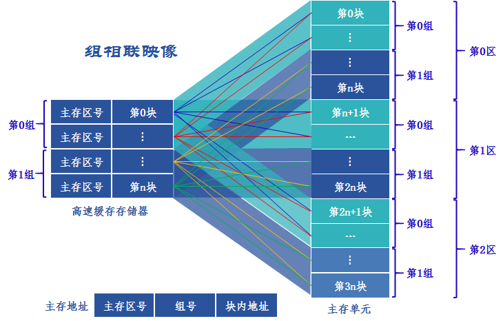 在进行地址变换时,可通过直接映像方式来决定组号,在一组内再用全相联映像方式决定高速缓存中的块号。通过比较主存地址高位决定的主存区号与缓存中的区号,即可决定是否命中。