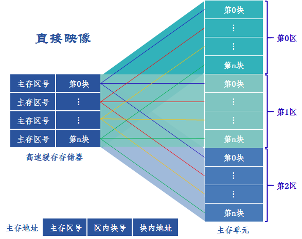 直接映像的图示如下,主存单元中的区块与缓存中内存块的关系是固定的,主存中的内存块只会存放在高速缓存存储器中的相同块号。因此,只要主存地址中的主存区号与缓存中的主存区号相同,则表明访问缓存命中。