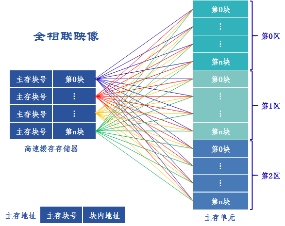 为了解决直接映射造成灵活性差,缓存空间无法充分利用的问题,全相联映像的方式被提出来。全相联与直接映像就是两个极端,一个只能整个区块进行对应,一个就允许任意主存的块调入高速缓存存储器中任意的块。