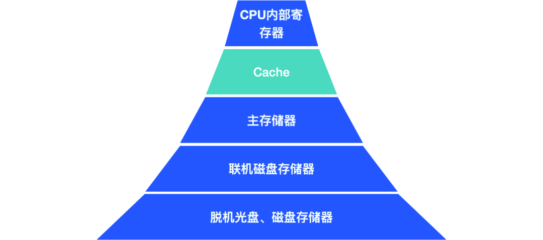 首先来讲讲计算机存储系统的层次结构。一般而言,通用计算机的存储层级分为四层,分别为 CPU 内部寄存器、高速缓存、主存储器和辅存储器。主存可以看作是一般而言的内存,而辅存又可根据是否与计算机相连分为联机和脱机两种类型。