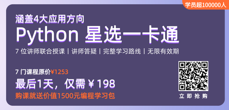 所以,为了让大家少走弯路,我们联合 7 位 Python 经验丰富的工程师,带来了这门<Python入门到实战-星选一卡通>套餐课,带你通过正确的学习路径,系统掌握 Python 编程及应用实战。