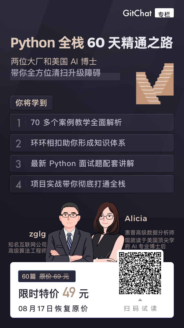 所以我提炼出过往 5 年多的工作经验,并和远在美国学府进修的 AI 博士后老师一起撰写了这个《Python 全栈 60 天精通之路》专栏。