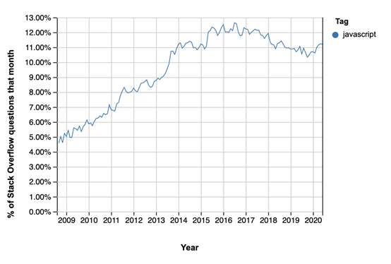 随着JavaScript库的兴起,也有越来越多的用户提出与这些库有关的问题。StackOverflow趋势记录了他们的问题与某个标签相关的百分比。看看在过去的十年中有多少关于JavaScript的问题: