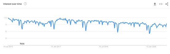 人们对JavaScript的兴趣似乎也在下降。通过查看过去5年“JavaScript”一词在google上的搜索频度,似乎也能看到这门语言正在慢慢走向衰落。