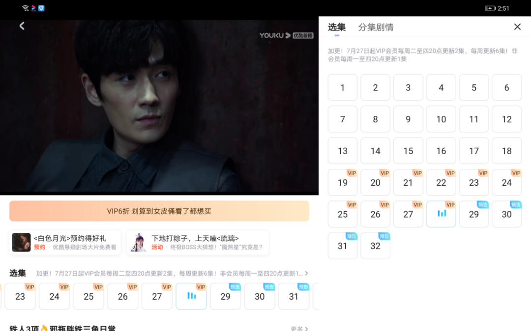 即该组件可以打开半屏,因为之前已经提到过在大屏横屏下半屏会在右侧展开区域展示,而右侧区域的大小随着设备,大屏模式的不同,宽度会不同,根据响应式SDK提供的容器宽度计算组件列数的方法(可参考响应式SDK的列数适配),处理后效果如下,左边屏幕选集展示9个,但是在右侧部分因为容器较小,展示6个,其他组件类似。在屏幕变化时,布局个数会做出相应的变化以适配不同的屏幕。