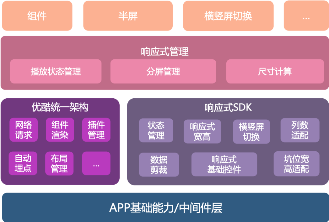在整个上层,实现一套响应式管理类,统一处理响应式下分屏状态,页面尺寸及组件根据不同尺寸适配的个数,大小等。最上层则是具体的组件,半屏及分屏策略的实现。