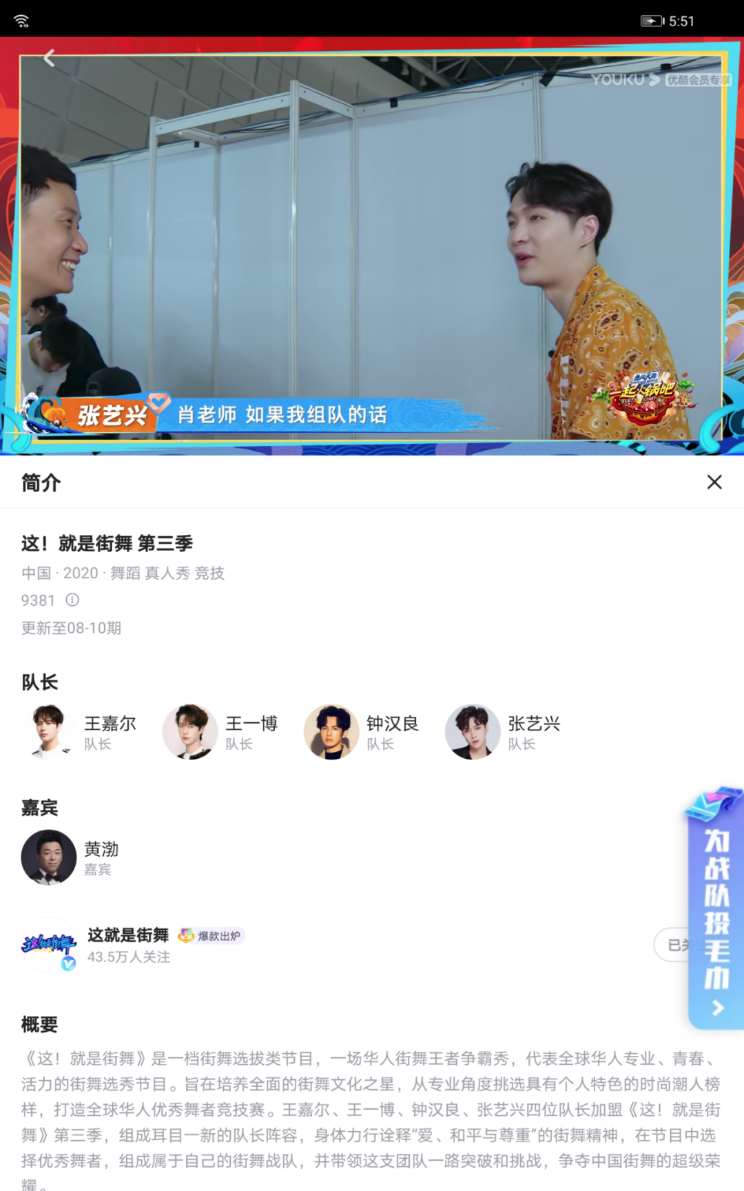 同时半屏也从会在右侧打开,既不影响播放,也不会覆盖左侧区域。比如简介半屏,效果如下: