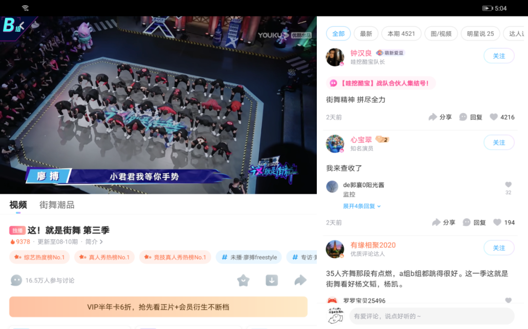 为了解决提到的特殊性播放比例适配的问题,采用在横屏模式下,播放页采用左右分屏的模式,将评论移到了右侧屏部分,这样可以让用户观看更多的有趣评论,以增加内容互动性;播放页横屏下展示效果如下图: