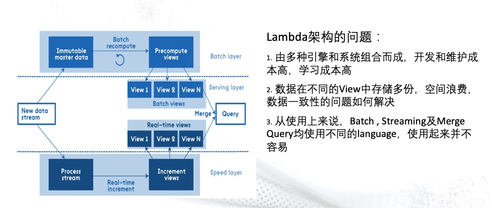 从2011年至今,Lambda架构被多数互联网公司所采纳,也确实解决了一些问题,但是随着数据量的增大、应用复杂度的提升,其问题也逐渐凸显,主要有: