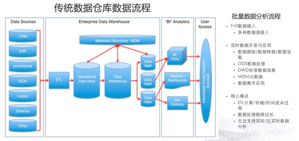 对于上面这些大数据业务场景,业界在很早之前就开始通过数据仓库的建设来满足这些场景的需求,比较传统的做法是如下图所示的离线数据仓库,其大致流程就是:首先将各类数据收集起来,然后经过ETL处理,再通过层层建模对数据进行聚合、筛选等处理,最后在需要的时候基于应用层的工具对数据进行展现,或者生成报表。