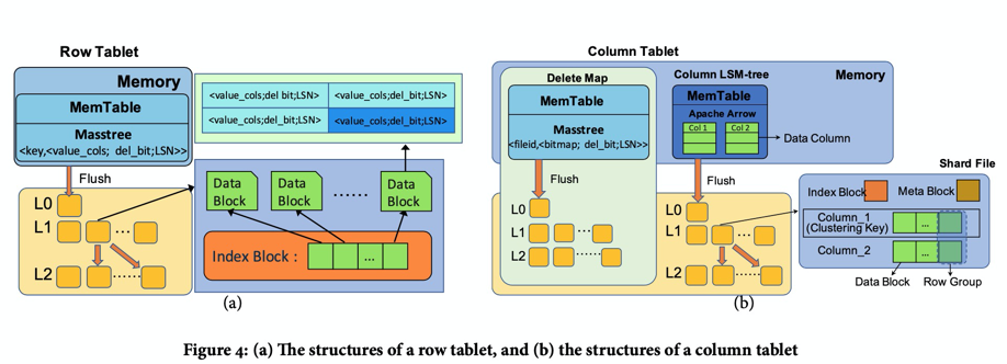 数据写入的时候先写log,log存储在分布式文件系统,保证整个服务的数据不会丢失,因为即便服务器挂掉也可以从分布式系统中恢复。Log写完之后再写MemTable,就是内存表,这样系统才认为是数据写入成功。MemTable有一定的大小,写满了之后会将其中的数据逐渐Flush到文件中,文件是存储在分布式系统中的。而对于行存储和列存储的区别就在Flush到文件的这个过程中,这个过程会将行存表Flush成行存储的文件,列存表会Flush成列存文件。在Flush的过程中会产生很多小文件,后台会将这些小文件合并成一个大文件。