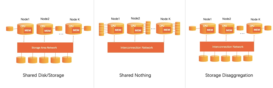 Shared Nothing:架构就是每个计算节点自己挂载存储,节点之间可以通信,但是各个节点之间的盘不共享,存在资源浪费的情况;