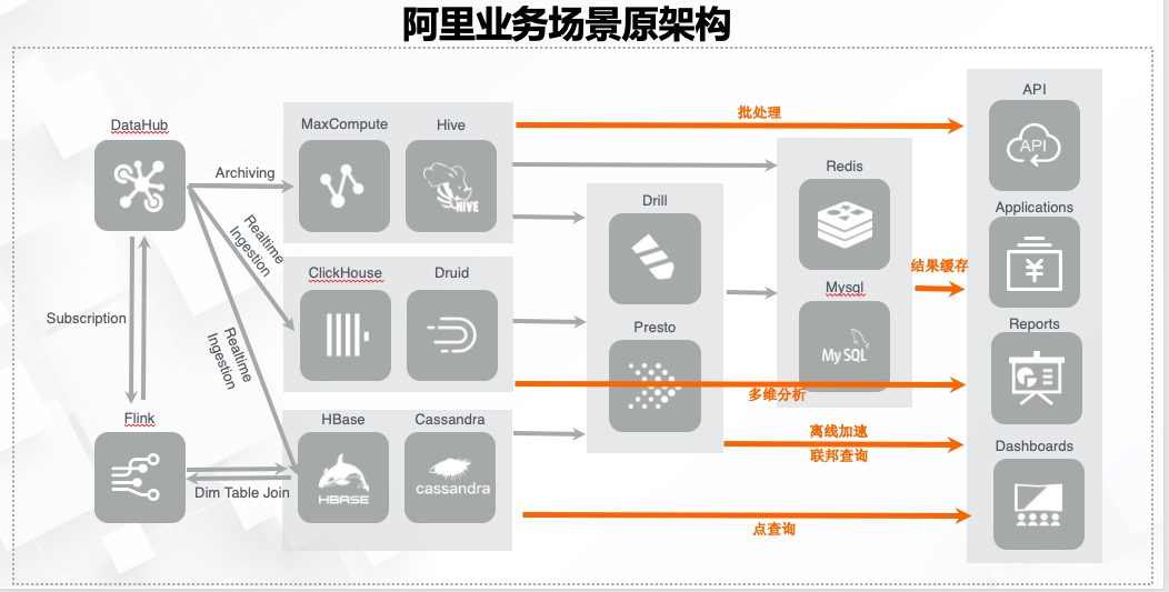 上面讲到的问题,在阿里内部其实也都遇到过。如下图所示是阿里巴巴在2011-2016年沉淀下来的一套实时数仓架构,其本质上也是Lambda架构,然而随着业务量及数据的增长,关系复杂度越来越大,成本急剧增加,因此,我们迫切的需要一种更优雅的方案去解决类似的问题。