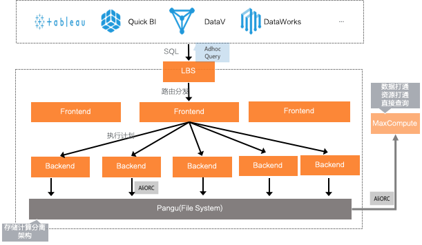 SQE(S QueryEngine):无缝对接MaxCompute(ODPS)的执行器,实现对MaxCompute的native访问,无需迁移和导入数据,就可以高性能和全兼容的访问各种MaxCompute文件格式,以及Hash/Range clustered table等复杂表,实现对PB级离线数据的交互式分析。