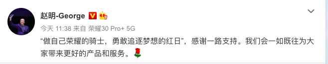 荣耀终端有限公司CEO赵明通过个人微博发文称,“做自己荣耀的骑士,勇敢追逐梦想的红日”,感谢一路支持。我们会一如既往为大家带来更好的产品和服务。
