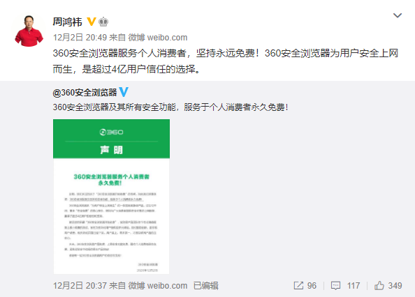 11月底360安全浏览器网站上线了VIP会员功能,引发了广大网友争议。不过目前360安全浏览器会员中心充值页面已经消失,据用户反馈,360安全浏览器12.3.1600.0 会员版已经下架了。12月2日,针对媒体报道 “360 安全浏览器将收费”一事,360 集团董事长兼 CEO 周鸿祎称:“360安全浏览器服务个人消费者,坚持永远免费!360安全浏览器为用户安全上网而生,是超过4亿用户信任的选择。”