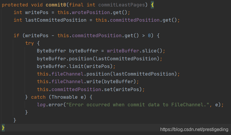 尽管 RocketMQ 与 Kafka 都支持 FileChannel 方式写入,但 RocketMQ 基于 FileChannel 写入时调用的 API 却并不是 transferTo,而是先调用 writer,然后定时 flush 刷写到磁盘,其代码截图如下: