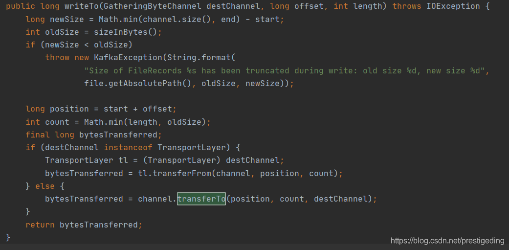 Kafka 的消息写入使用的是 FileChannel,其代码截图如下: